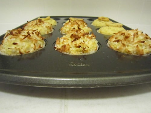 Scoop the batter evenly into the muffin tray. Sprinkle with coconut.