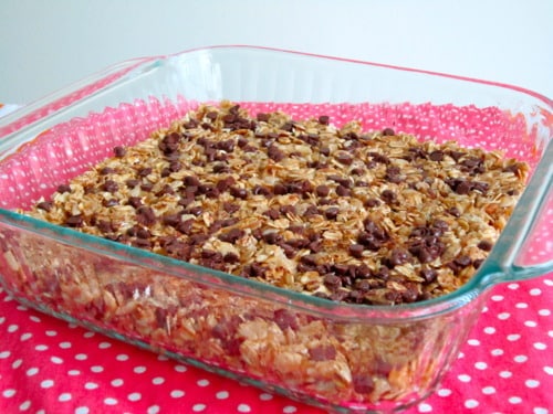 Let cool at room temperature for at least 2 hours, or until the chocolate chips are set, before cutting into bars.