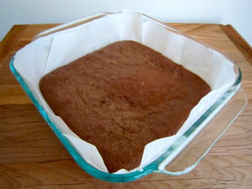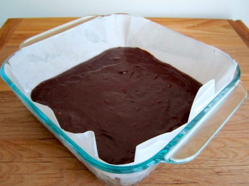 Preheat the oven to 350 degrees F. Lightly coat an 8×8 baking dish with nonstick spray; then line the baking dish with parchment paper.
