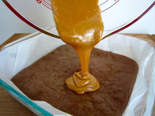 Immediately spread the hot caramel mixture evenly over the bottom brownie layer.