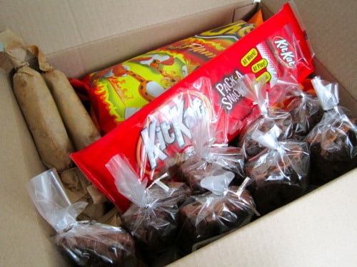 This is what his finished care package looked like: a couple of the No Bake Chewy Chocolate Chip Granola Bars, Hot Cheetos, Kit Kat bars, and of course, 8 caramel filled brownies.