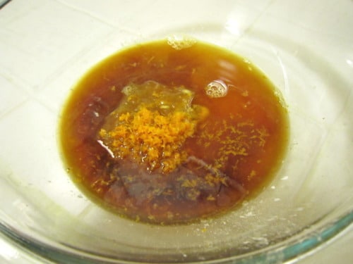 In a large bowl, whisk together the soy sauce, beef broth, orange zest, orange juice, orange marmalade and cornstarch.