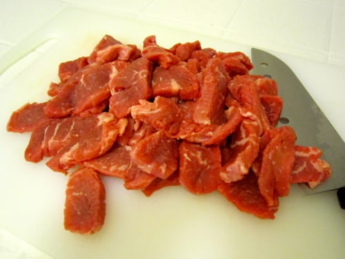 Thinly slice the flank steak, about 1/4-inch thick, across the grain. (It will be easier to slice the beef in thin strips if it has been partially frozen.)