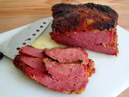 Serve corned beef with leftover pan juices, roasted cabbage, roasted carrots and red potatoes.