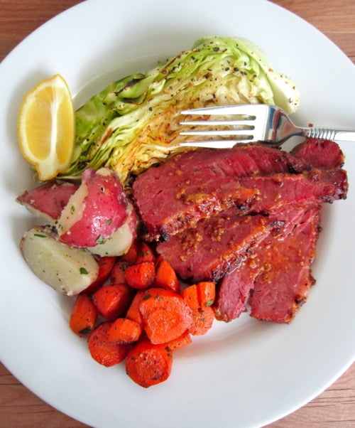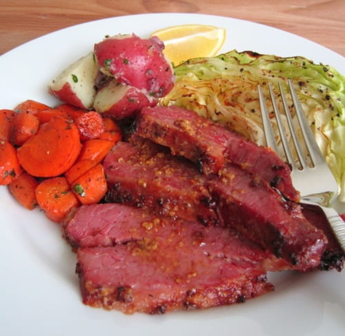Baked Honey-Mustard Corned Beef with Roasted Cabbage, Roasted Carrots, and Buttered Red Potatoes