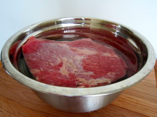 Soak the corned beef in a large bowl of cold water for about 1 hour to remove some of the salt and sodium. (Alternatively, you can boil it over high heat for 1 minute. Just be sure to pat the corned beef dry.)