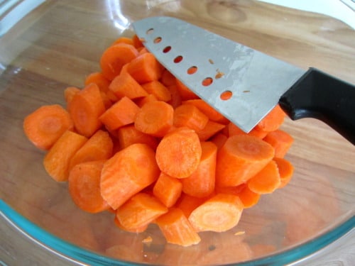 Slice the carrots using the roll-cut technique, rotating the carrot 180 degrees after each cut. (This will expose a lot of surface area of the carrot.)