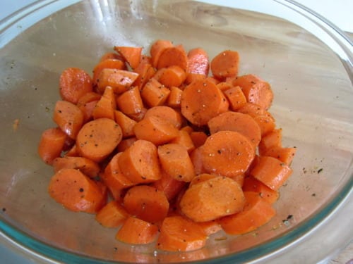 In a large bowl, combine the carrots, olive oil, balsamic vinegar, nutmeg, salt and pepper, to taste.