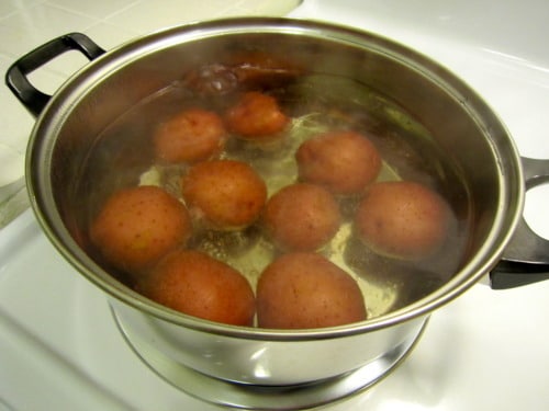 In a large pot of cold, salted water, bring the potatoes to a boil; cook until the potatoes are fork-tender, about 15 minutes; drain well and let cool enough to handle.