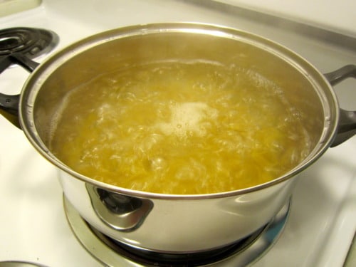 In a large pot of boiling salted water, cook pasta according to package instructions; drain well.