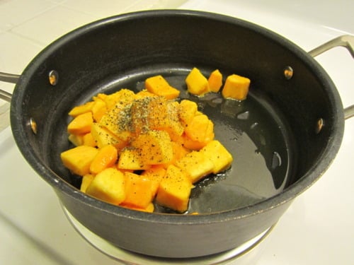 Heat 2 tablespoons olive oil in a large skillet over medium high heat. Add the squash, sage, salt and pepper, to taste.