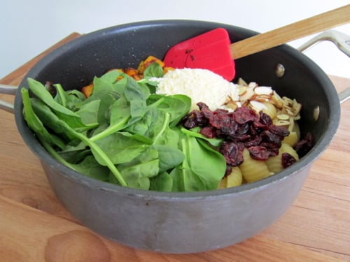 Add the 2 remaining tablespoons olive oil, pasta, spinach, cranberries, almonds and Parmesan.