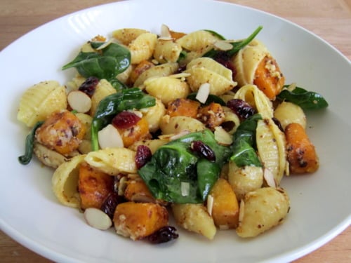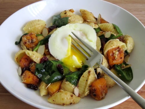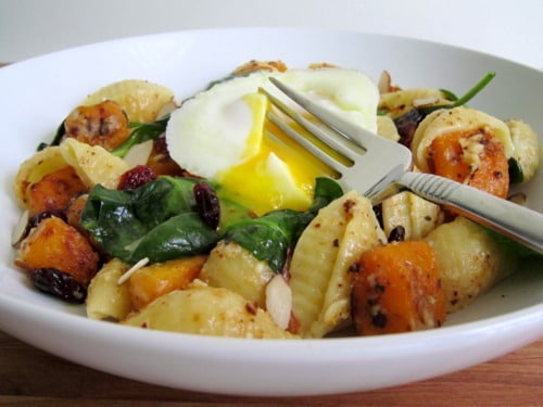 This pasta dish is incredibly easy to make with very minimal cooking, which makes it perfect for a weeknight meal. The only cooking involved is the butternut squash and the pasta. Easy peasy. Once all that is cooked through, they get tossed together with some olive oil, spinach, cranberries, almonds and freshly grated Parmesan. Then top it off with a poached egg and voila, dinner is served in 20 minutes.