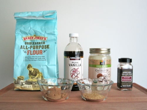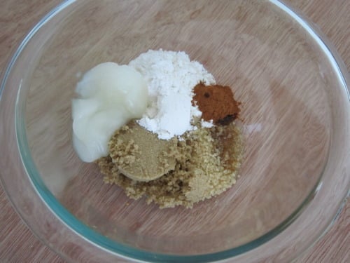 To make the streusel topping, combine the flour, sugars, cinnamon, coconut oil and vanilla in a small bowl; set aside. (The topping will be very moist.)