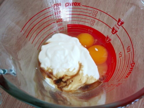 In a large glass measuring cup or another bowl, whisk together the yogurt, butter, sugar, eggs and vanilla.