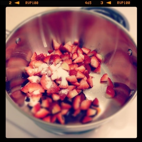 So with all the strawberries that I had, I left a pound of strawberries aside for this week’s Muffin Monday. But I still needed to figure out what I would do with the rest of it before it goes bad so I decided to make Pastry Affair’s Strawberry Balsamic Jam. It’s an incredibly easy recipe where you simmer a pound of strawberries with some sugar and balsamic vinegar.