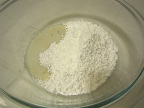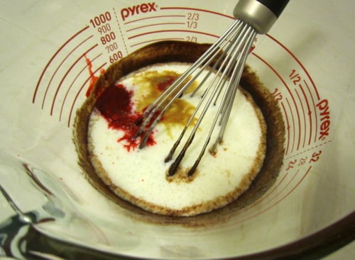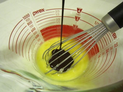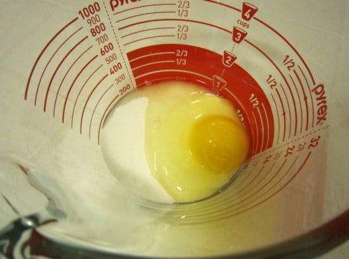 In a large glass measuring cup or another bowl, whisk together the sugar and egg.