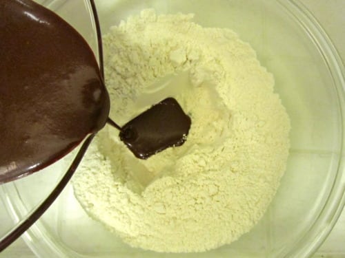 Pour mixture over dry ingredients and stir using a rubber spatula just until moist.