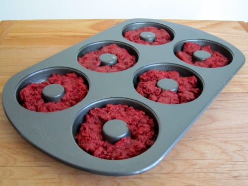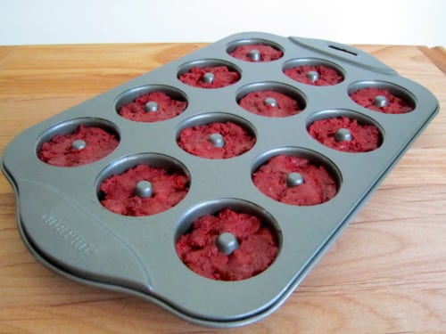 Scoop the batter evenly into the donut pan. (A piping bag is usually perfect for this but because the batter is thick, I used my hands.)