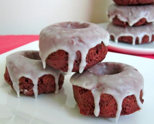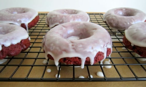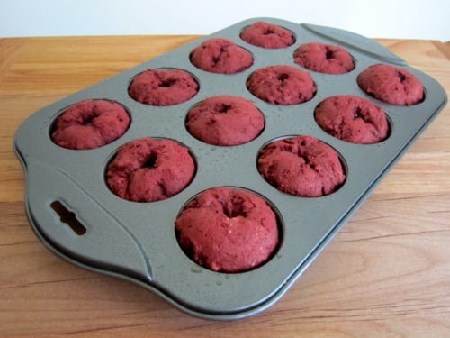 These red velvet donuts were an absolute cinch to whip up, and I made both regular-sized donuts and mini donuts. It was a very thick batter so instead of a “cakey” type of donut, it was a wonderfully crumby one with just enough chocolatey “cakeyness” in the center. Also, be cautious of the mini donuts. They look incredibly cute and hard to resist. That being said, I ate 5 of them without even blinking.