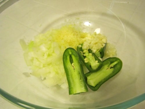 In a large bowl, combine the onions, garlic, ginger and jalapeno.