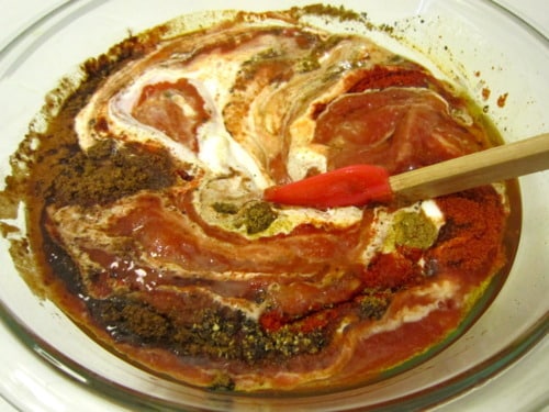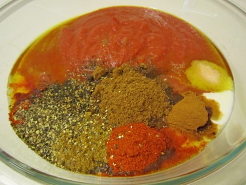 Stir in the tomato puree, yogurt, olive oil, lemon juice, garam masala, cumin, paprika, cinnamon, cayenne pepper, salt and pepper.