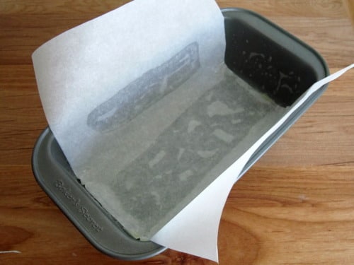 Preheat the oven to 350 degrees F. Lightly coat an 9×5 loaf pan with nonstick spray; then line the baking dish with parchment paper; set aside.