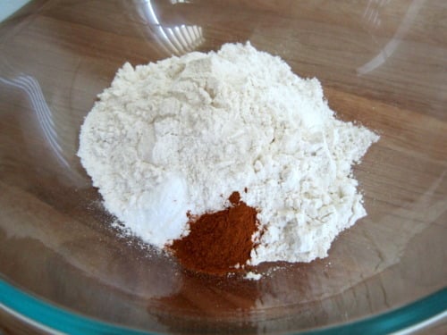 In a large bowl, combine the flour, baking soda and cinnamon.