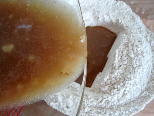 Pour mixture over dry ingredients and stir using a rubber spatula just until moist.
