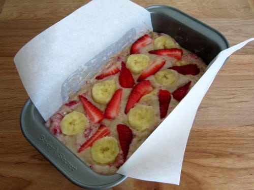 Top with strawberries and banana slices, using your fingertips to gently press them into the batter.