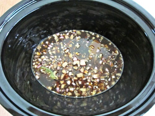 Lightly oil the inside of the slow cooker. Add the shallots, garlic, brown sugar, cayenne, black pepper and bay leaves.