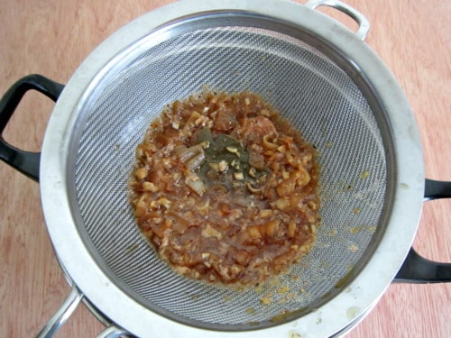 Strain the remaining sauce into a pot and cook over medium high heat, stirring frequently, until reduced by half, about 8-10 minutes.