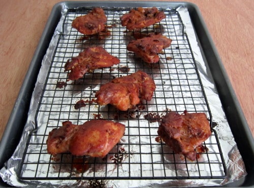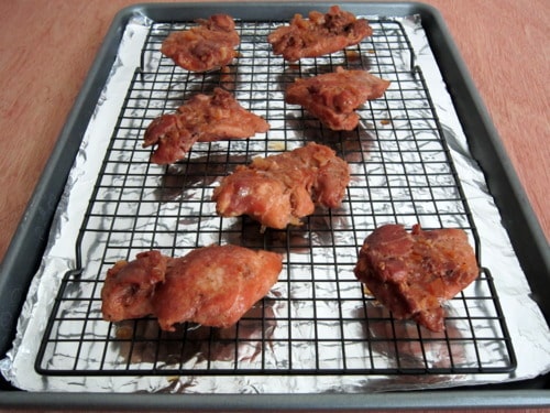 Remove the chicken thighs from the slow cooker and place onto the prepared baking sheet.