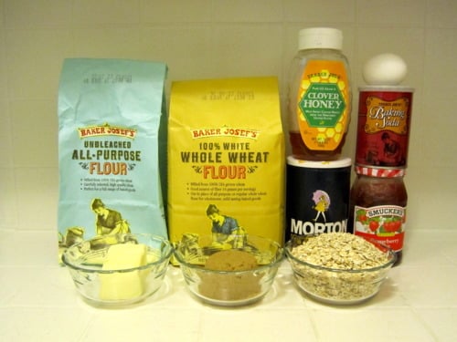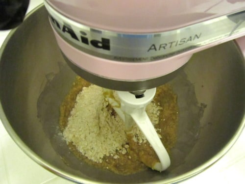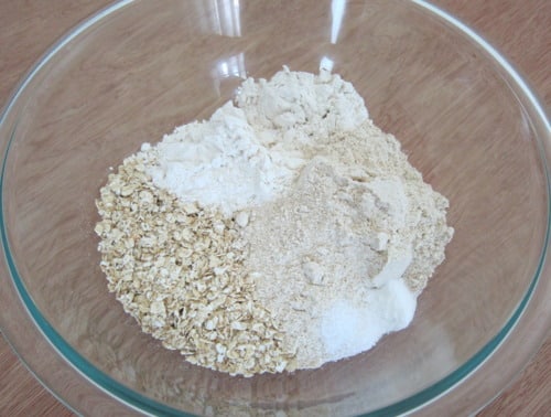 In a large bowl, combine the oats, flours, baking soda and salt.