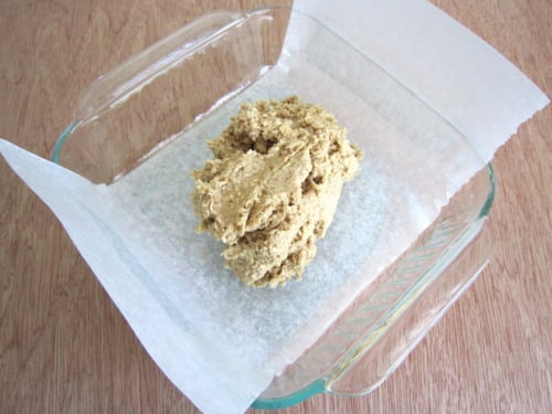 Preheat oven to 350 degrees F. Lightly coat an 8×8 baking dish with nonstick spray; then line the baking dish with parchment paper.