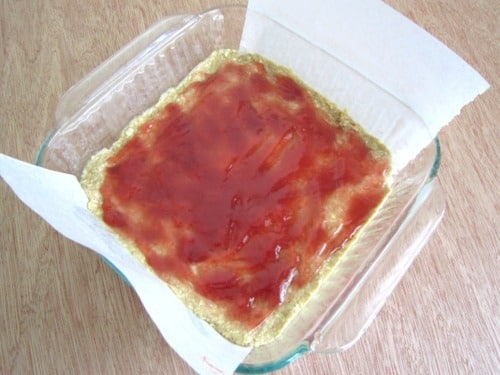 Spread the strawberry jam evenly over the bottom layer.