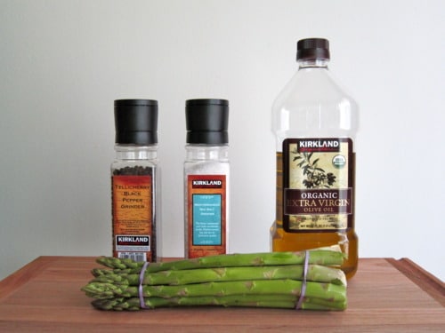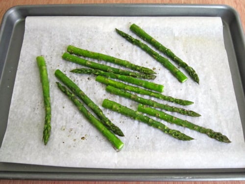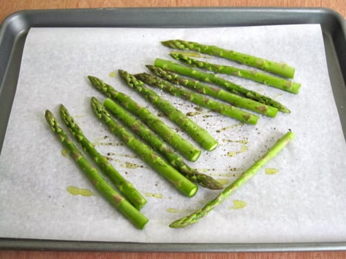 Place the asparagus in a single layer onto the prepared baking sheet. Drizzle with olive oil, salt and pepper, to taste; gently toss to combine.