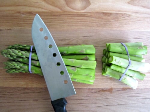 Trim the tough, woody ends of the asparagus, usually about 1 1/2 inches.