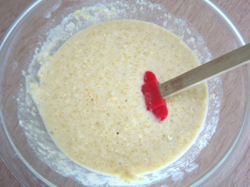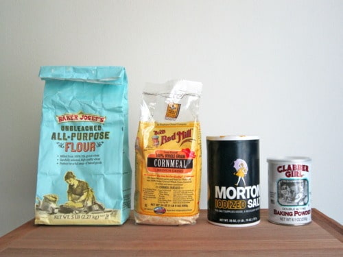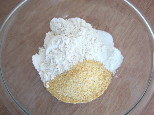 In a large bowl, combine the cornmeal, flour, baking powder, salt and sugar.