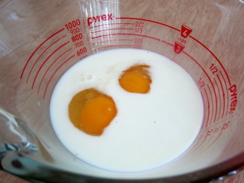 In a large glass measuring cup or another bowl, whisk together the honey, applesauce, milk, eggs and butter.