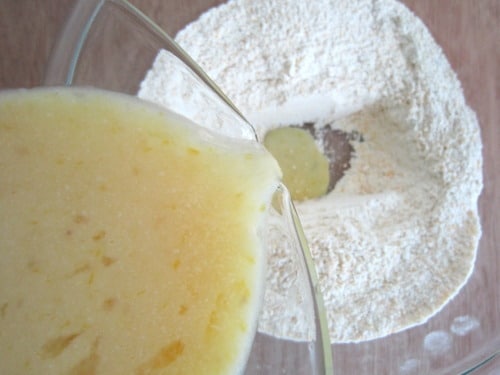 Pour mixture over dry ingredients and stir using a rubber spatula just until moist.