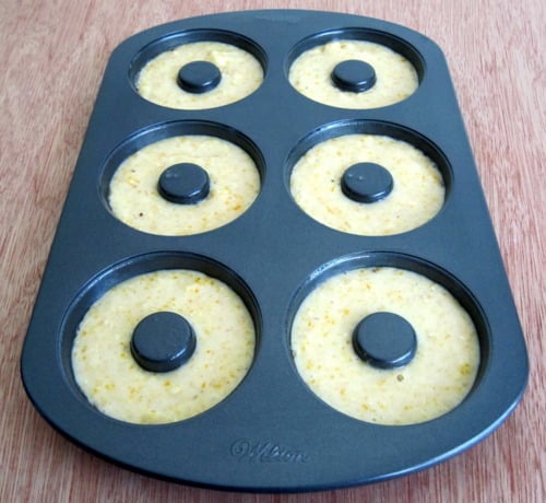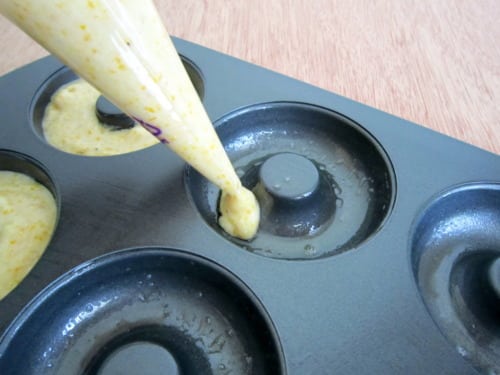 Scoop the batter evenly into the donut pan. (A piping bag is perfect for this.)