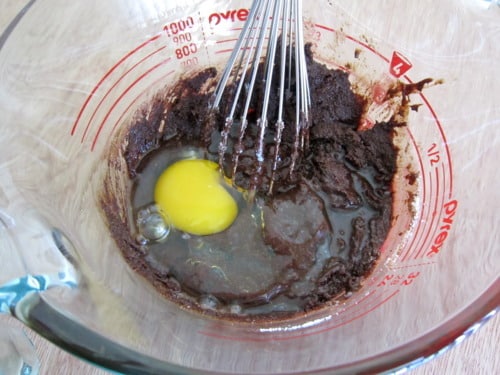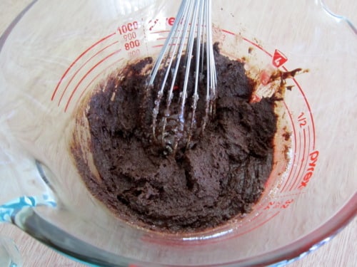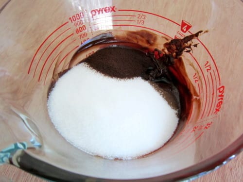Add the sugar, espresso powder and vanilla, whisking until well combined.