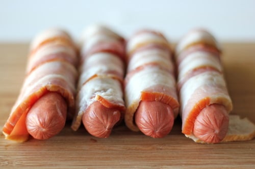 Now we’ll wrap each hot dog with some good quality bacon. Trader Joe’s has the best kind of apple smoked bacon.