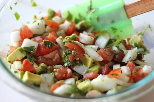 Let’s start with the avocado pico de gallo. We’ll toss some tomatoes, onions, cilantro and lime juice, stirring in the avocados at the very end so they don’t get all mushed up and guacamole-like.
