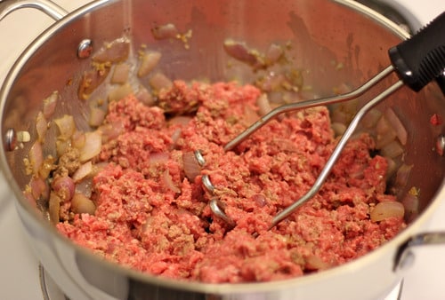 Add the beef and cook until browned, about 5-10 minutes, making sure to crumble the beef as it cooks.