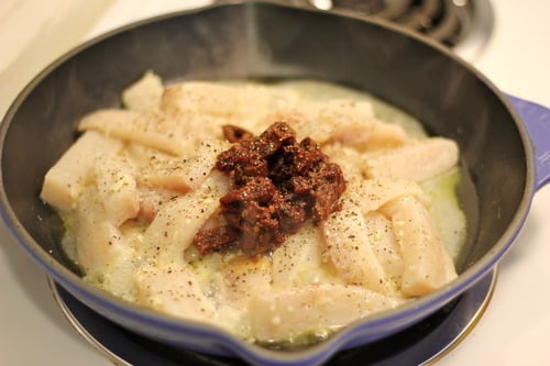 Now let’s take the lime-garlic-fish mixture and throw it into a skillet with some more cut-up chipotle peppers.