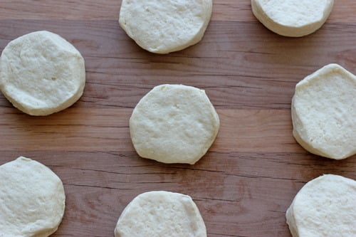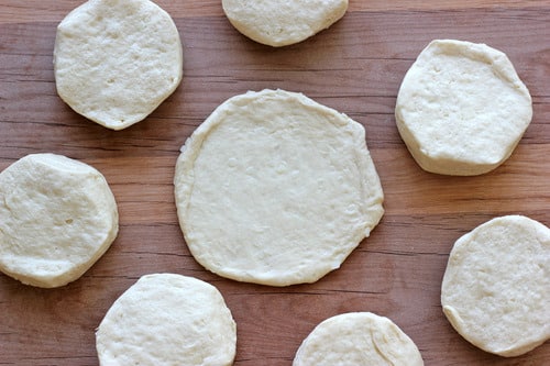 On a lightly floured surface, press or roll each biscuit into a 6 or 7-inch round.
