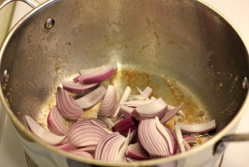 Go ahead and transfer the chicken to a clean plate and then throw in some red onion wedges back to the skillet.
