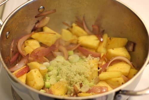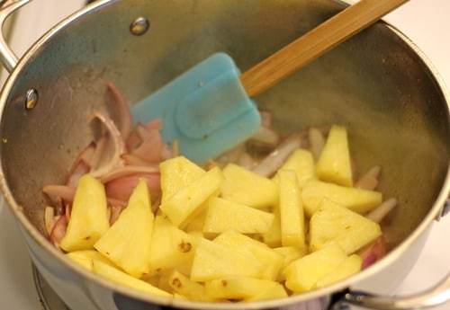 Once the onions brown a bit for about 2 minutes, we’ll add the pineapple and let it heat through for about a minute.